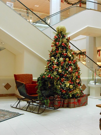 The first large store you may notice is Von Maur. This store is dedicated to details: providing a live pianist to grace the atrium with Christmas tunes; adding a sparkling, white top hat to the boys’ clothing display; or arranging the plaid gifts just so under a myriad of beautifully appointed Christmas trees. All the decorations are gold and red, glowing in a classy arrangement of garlands and swags all around the store.